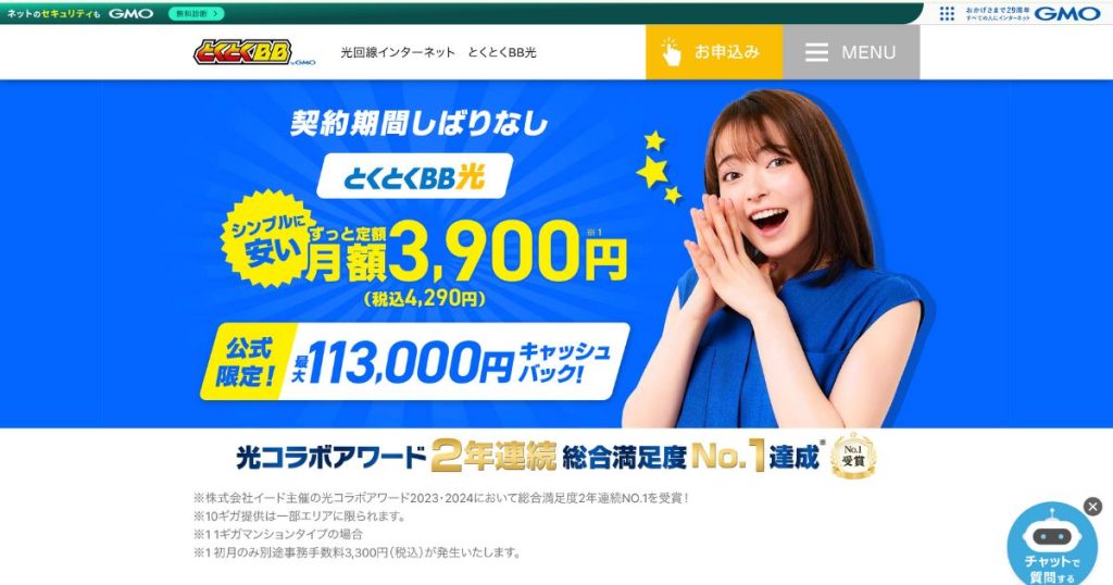 | GMOとくとくBB光 | 4,818円 | 最大157,000円 | なし | 実質無料キャンペーン | 3,300円 | 契約期間・解約金なし | なし(縛りなし) | 最大10Gbps | 全国 |
