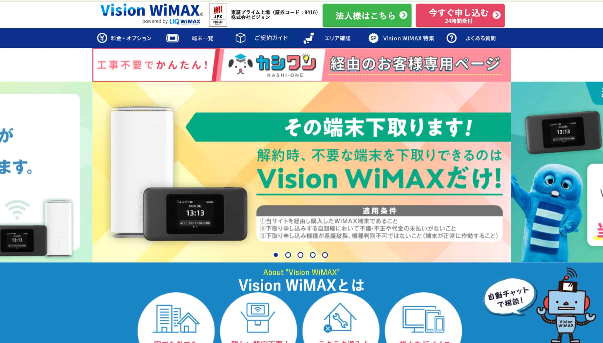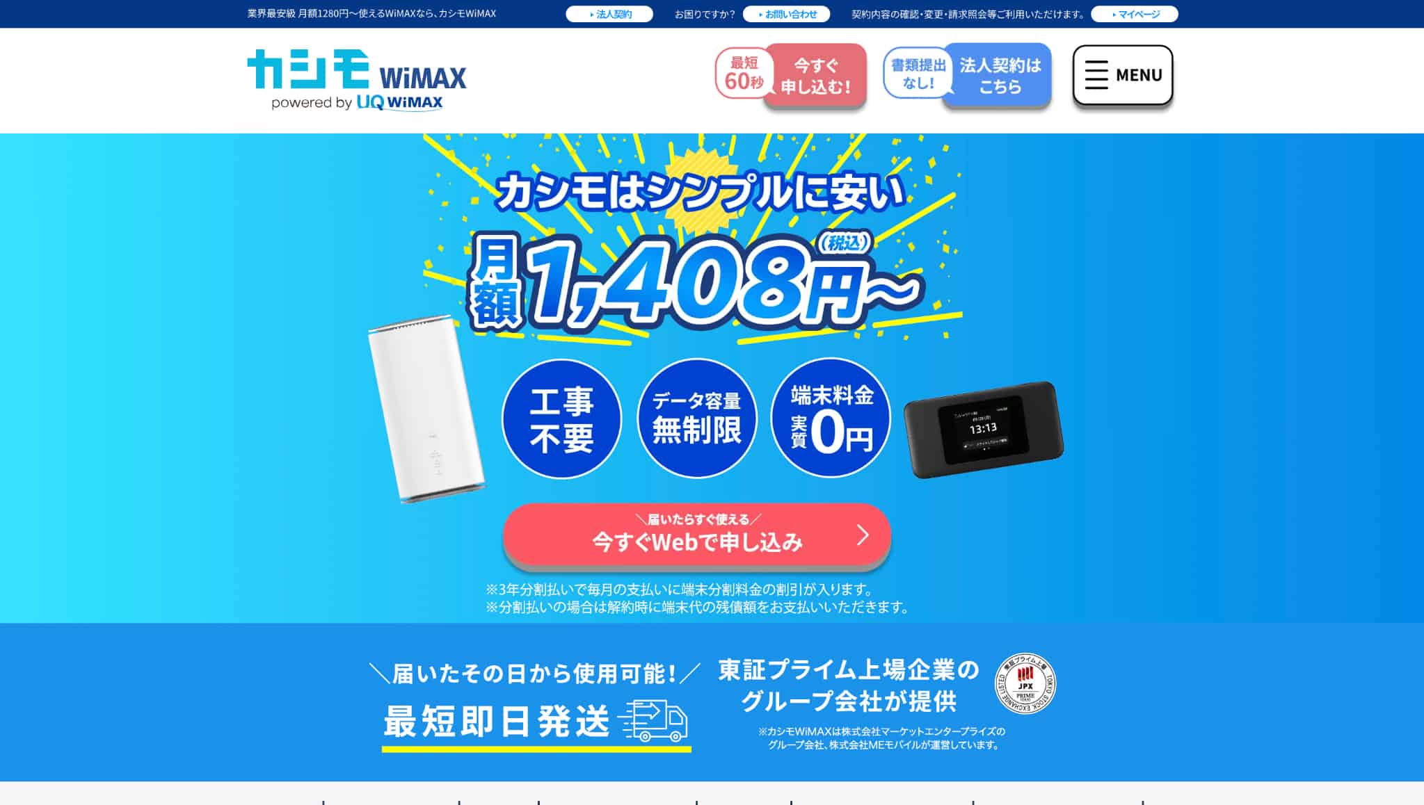 WiMAX(ワイマックス)は、工事なしですぐに使える無線インターネットサービスです。