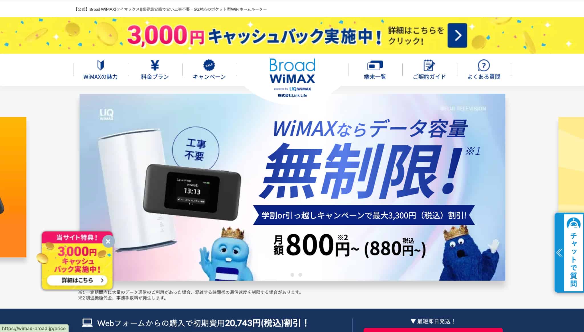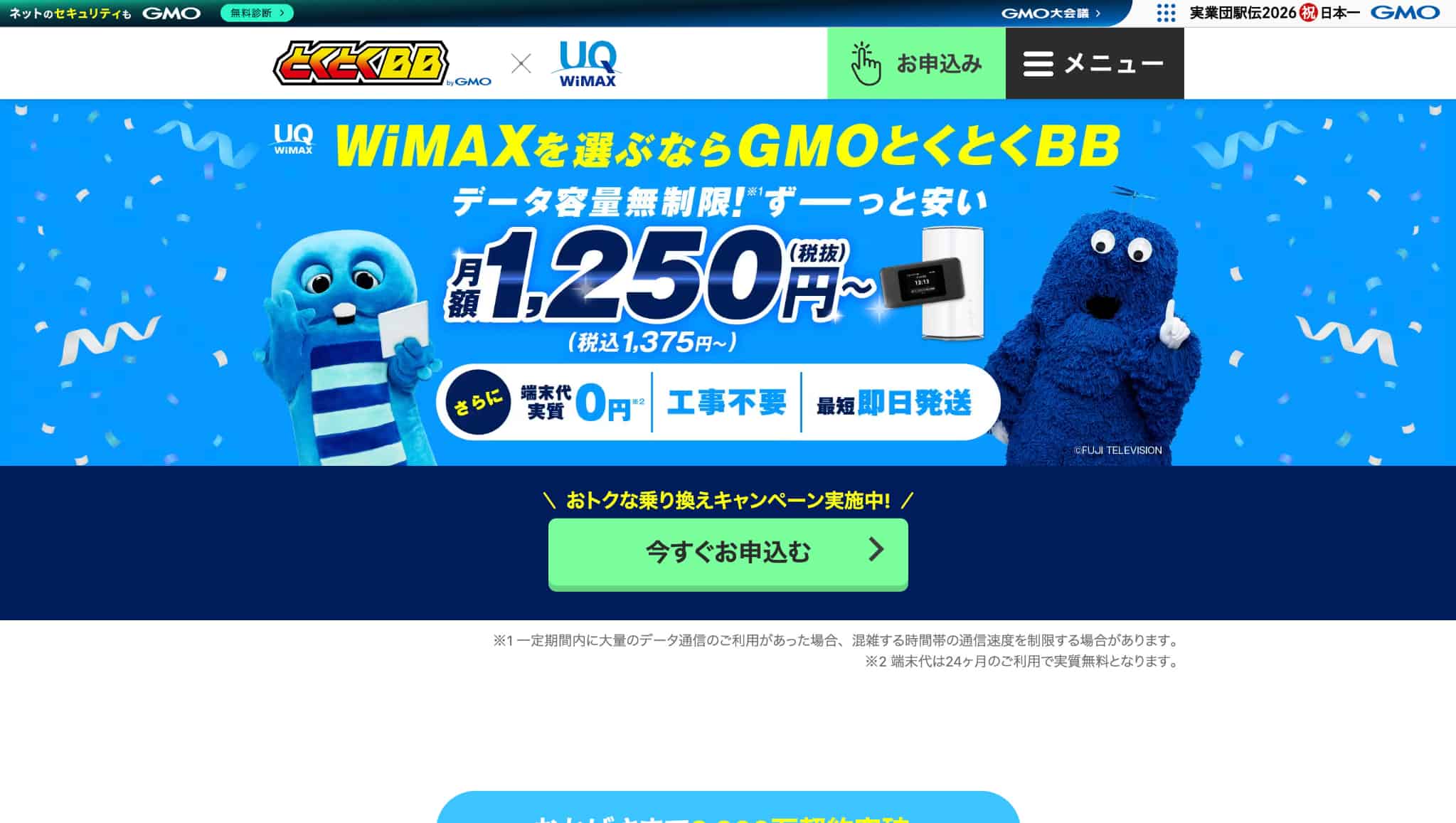 GMOとくとくBB WiMAX 高額キャッシュバック系特典(条件あり)/乗り換えサポート(条件あり)/端末実質0円を狙える(条件あり) 初月:1,375円/翌月以降:4,807円