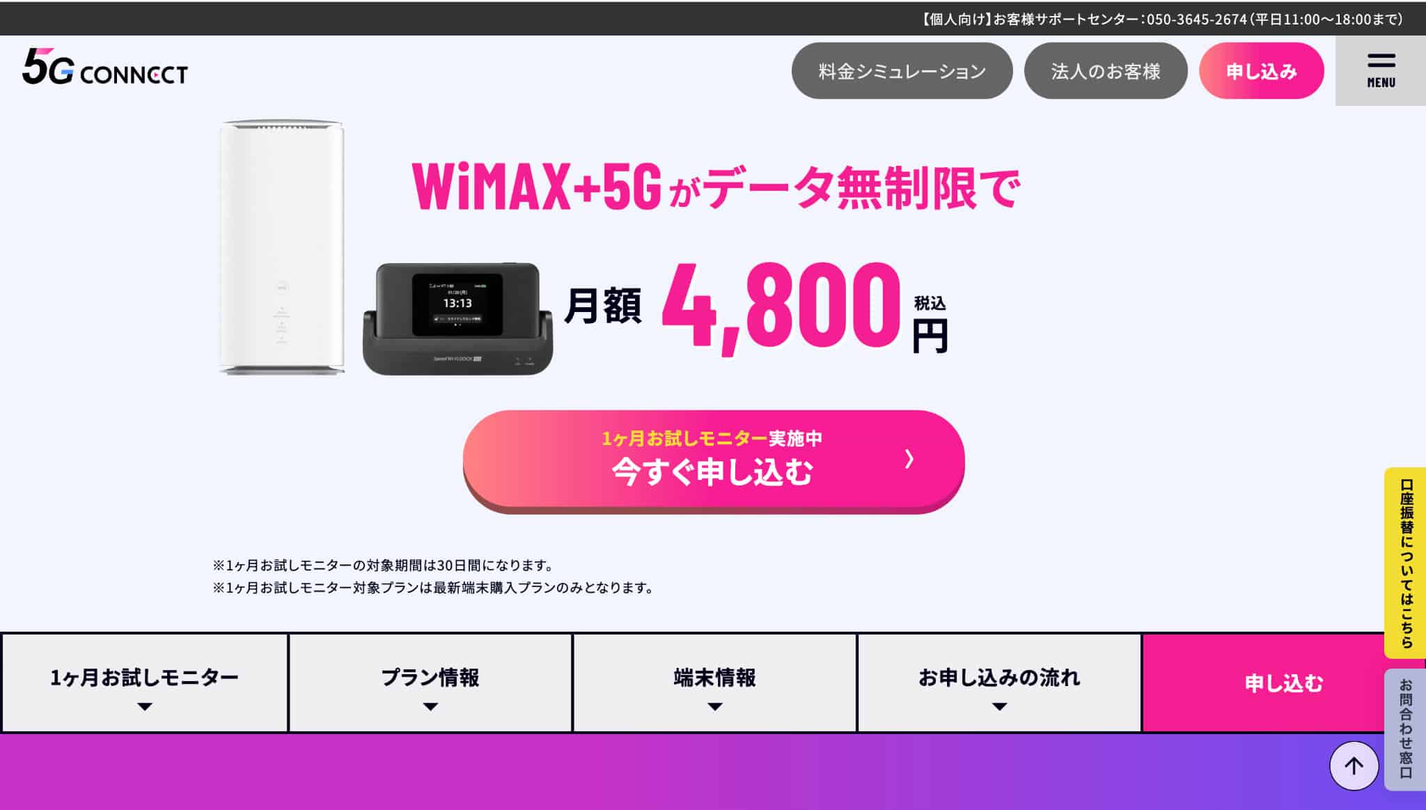 5G CONNECT 月額0円の月がある(条件あり)/端末0円プランあり(条件あり)/支払い方法の選択肢がある 4,800円(3・6・9・12・15ヵ月目は0円の月あり:条件あり)