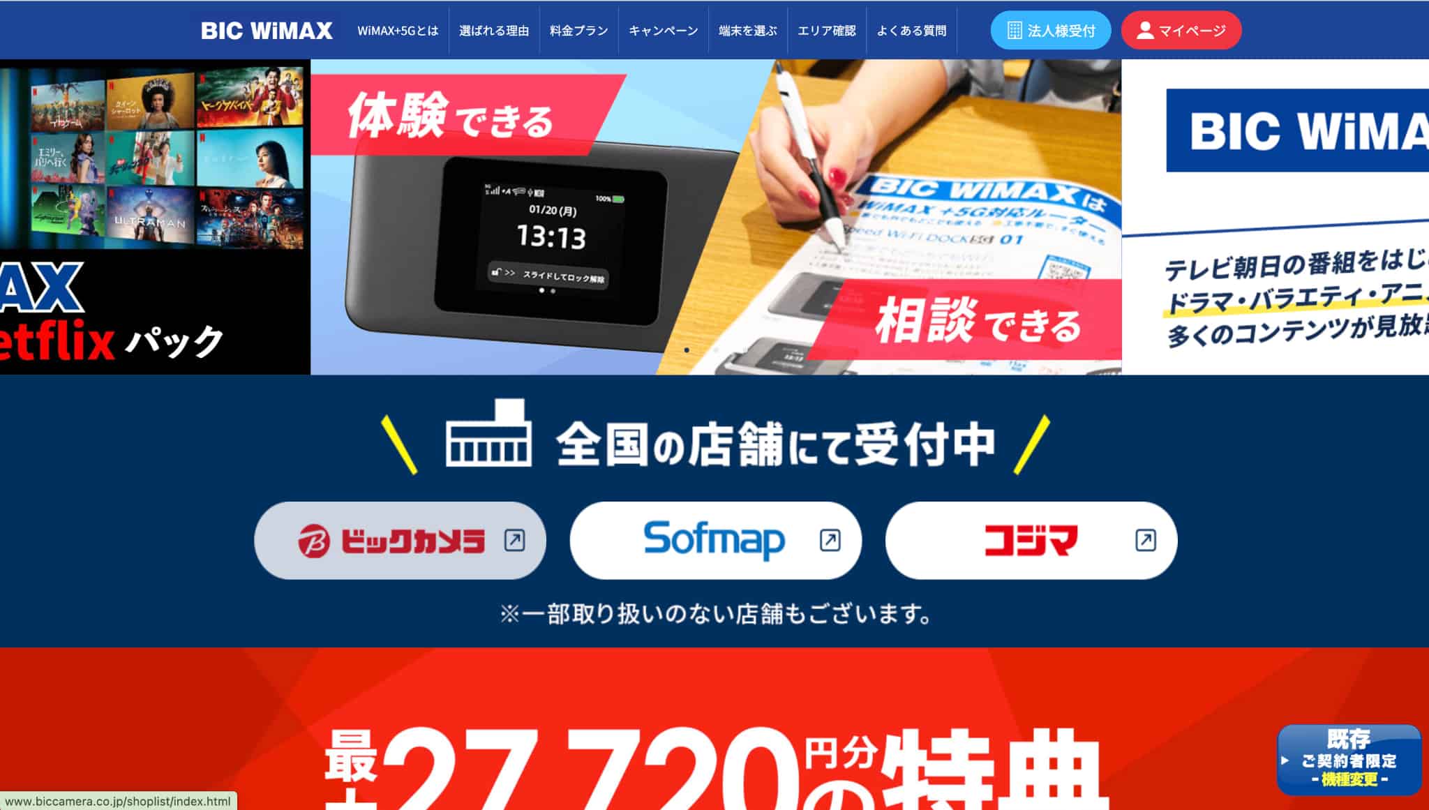 BIC WiMAX 店頭で申し込み・受け取りがしやすい/ポイント還元系特典がある/au・UQのセット割対象 1〜13カ月目:4,268円/14カ月目以降:4,950円