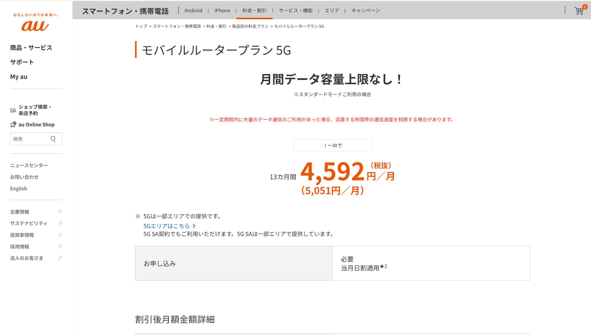 au(WiMAX +5G) キャリア窓口で契約できる/端末割引施策がある/口座振替に対応 5,051円〜