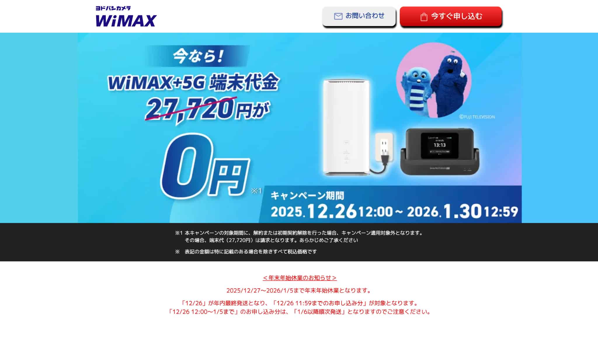 ヨドバシカメラWiMAX 端末0円キャンペーンがある/店頭受け取りしやすい/au・UQのセット割対象 初月:0円/1〜13ヵ月目:4,268円/14ヵ月目以降:4,950円