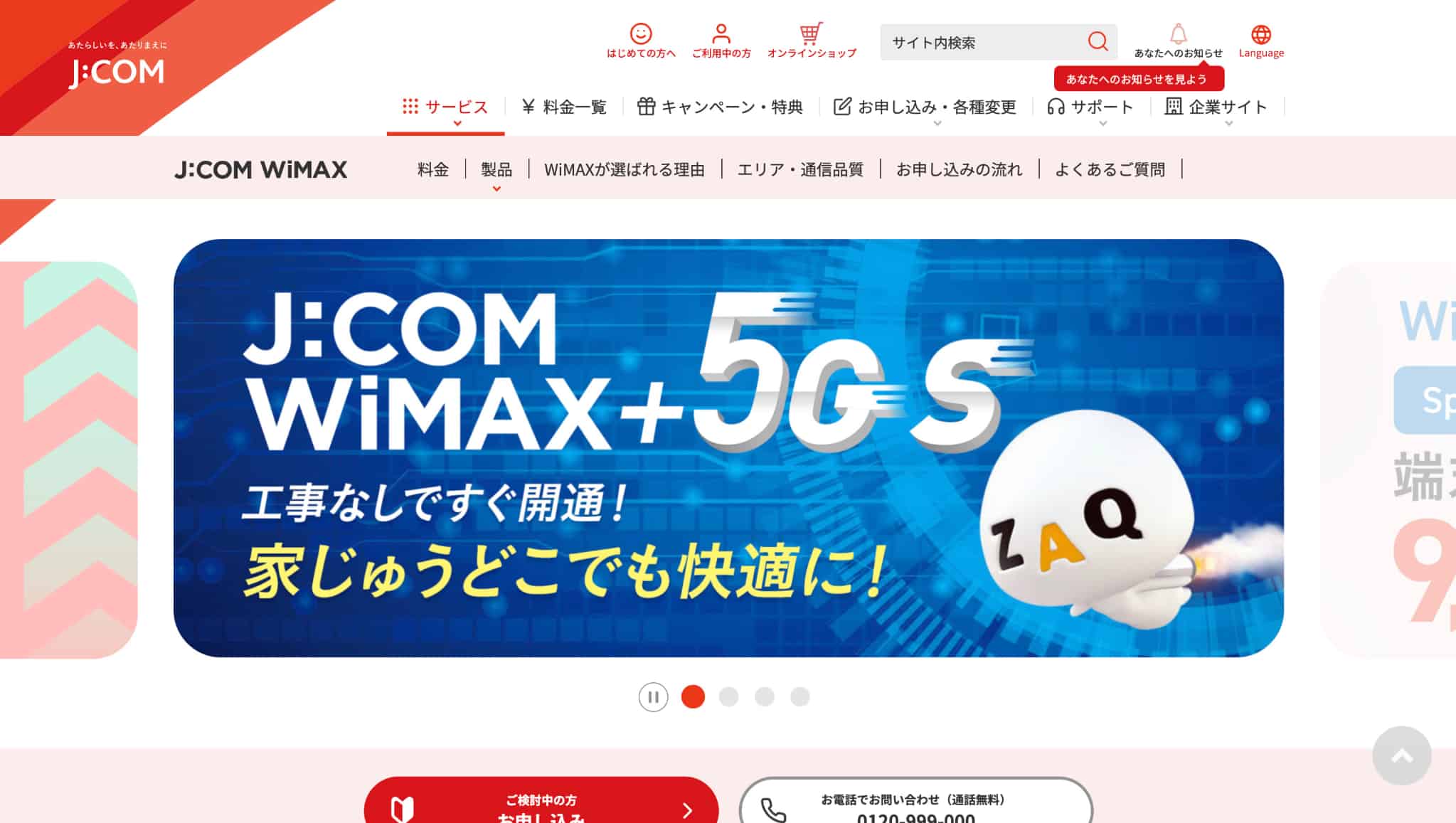 J:COM WiMAX 初月無料で始めやすい/月額割引がある/au・UQのセット割対象 初月:無料/1〜12ヵ月目:4,268円/14ヵ月目以降:4,950円